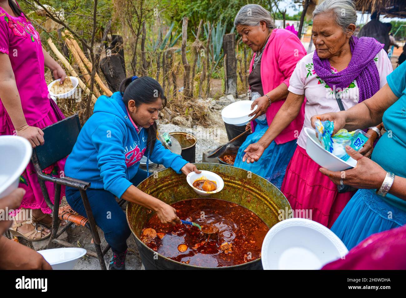 Yaqui indigenous community gathered for a traditional Wacabaque meal, meat with chili, Cocido De