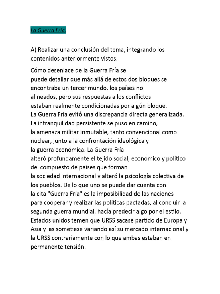 Conclusion de Guerra Fría. Páginas: 4 (929 palabras) Publicado: 19 de noviembre de 2014. Se podría decir que el propósito de la guerra fría, no fue para nada una guerra ideológica, sino mucho menos que eso, fue la competencia entre dos países, que al encontrarse en el momento preciso, enel instante preciso, quisieron, cada uno por su.