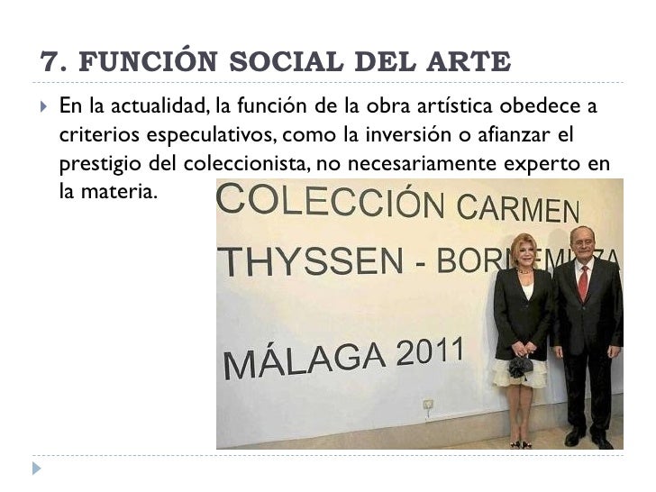 La contemplación de obras de arte enriquece y da forma a la sensibilidad artística del espectador. Función ornamental. El arte se usa para transformar un espacio. Función mercantil. Las obras de arte tienen un valor de cambio y el arte se convierte en un producto más. Con esta función aparecen intermediarios que ponen en circulación las.