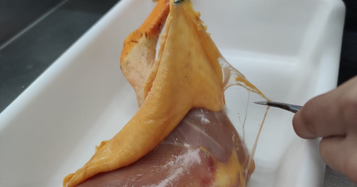Procedemos a retirar las capas superficiales (plumas y epidermis) Protocolo. Una vez retirada la epidermis por completo, realizamos las primeras disecciónes en busca de tendones y huesos. Protocolo. Protocolo. Finalmente, procedemos a separar los tejidos muscular y conectivo del tejido óseo para observarlo mejor.