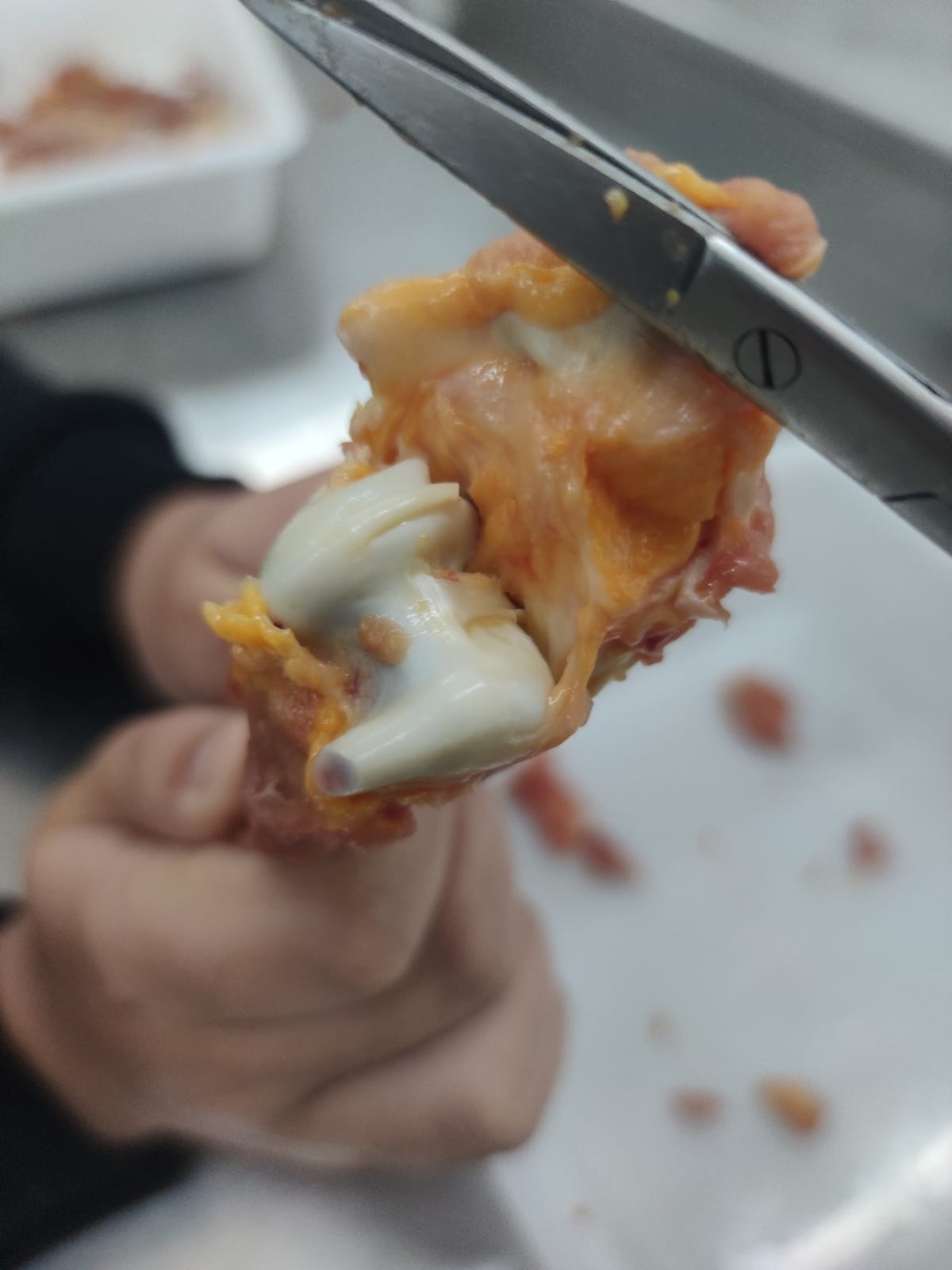 En la parte A se puede observar que la pata de pollo está en reposo, sin embargo, si se tensa el tendón, como se hizo en la parte B, la pata de pollo se contraerá tal y cómo se observa en la imagen, del mismo modo, si se deja de aplicar esta tensión, la pata volverá a su estado original (A). Figura 5. Fémur del pollo.