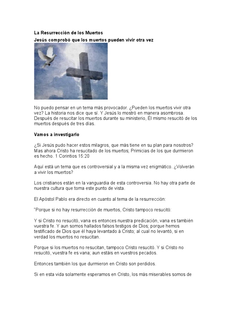 La resurrección de los muertos es una doctrina central de la fe cristiana que enseña que Jesucristo resucitó de entre los muertos y que los seres humanos también se levantarán de la muerte. Es un acto de poder de Dios que transformará nuestros cuerpos mortales en cuerpos gloriosos, como el de Cristo, esta esperanza nos da vida eterna con.