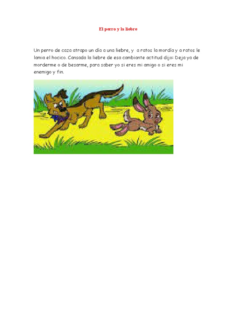 De Wikisource, la biblioteca libre. metadatos. Ελληνικά English français. Un perro de caza atrapó un día a una liebre, y a ratos la mordía y a ratos le lamía el hocico. Cansada la liebre de esa cambiante actitud le dijo: - ¡Deja ya de morderme o de besarme, para saber yo si eres mi amigo o si eres mi enemigo! Moraleja: Sé siempre.