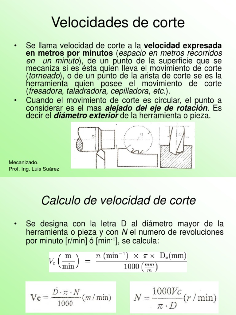 Velocidad de corte (V c) Es la velocidad a la que gira la herramienta -su filo- sobre la pieza. Se suele usar como unidad los metros por segundo (m/s). Es decir, los metros por segundo que recorre un punto del diente de la herramienta que realiza el movimiento de corte, como ocurre con la fresadora (pero también con la taladradora o la.