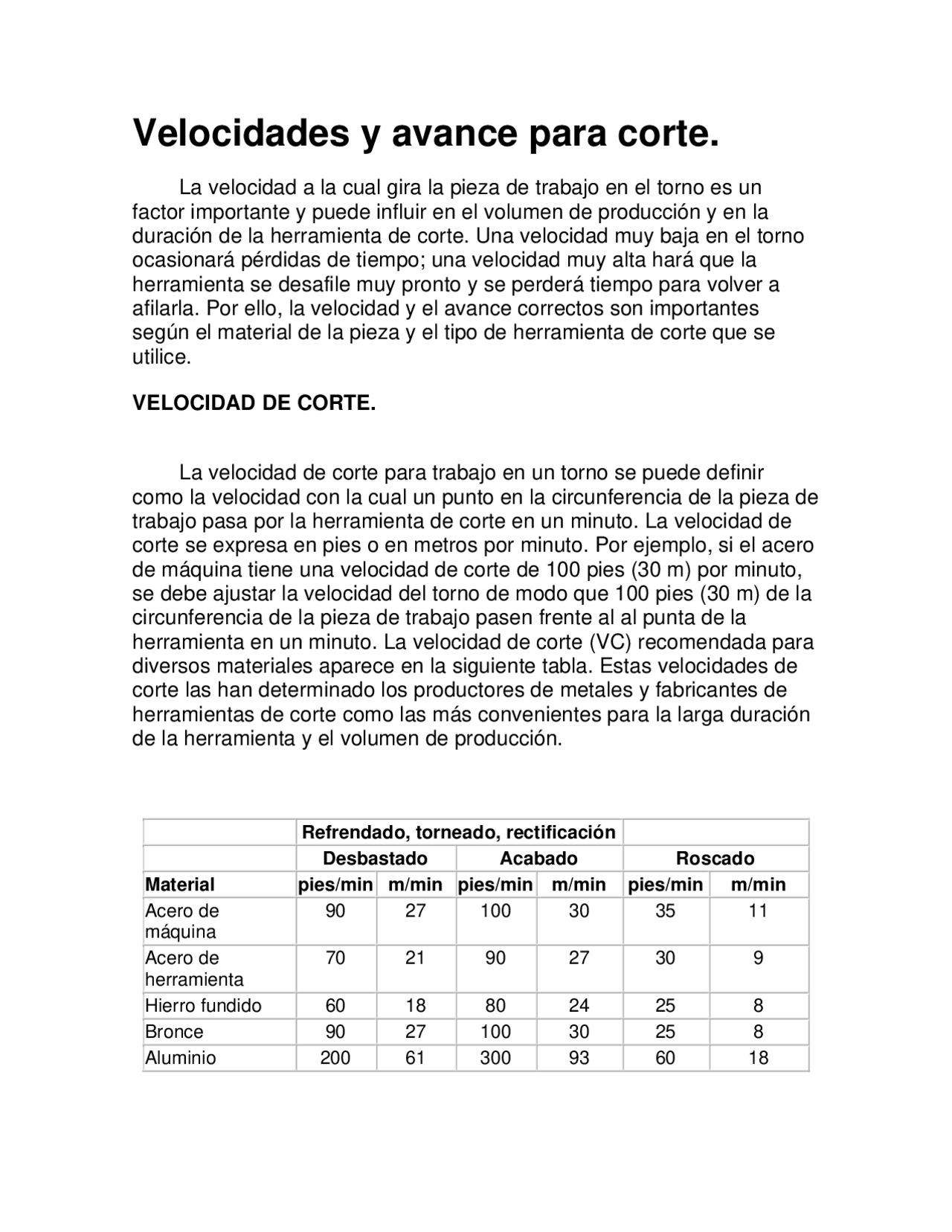 Velocidad de Corte y Avance PDF Industrias Ingeniería mecánica