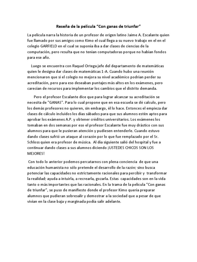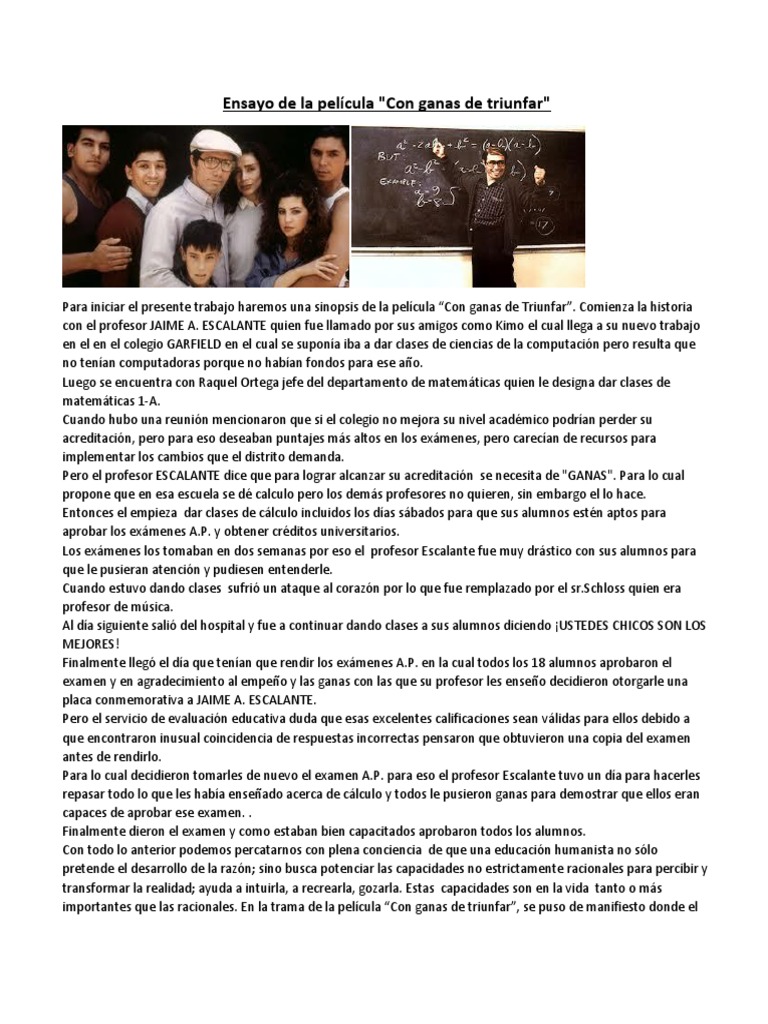 Con Ganas de Triunfar. Reseña y reflexión. Esta película fue emocionante, gratificante e inspiradora para mí, habla de algo que seguimos viviendo hoy en día, la poca o nula importancia por hacer un poco más en las aulas de clase y en la vida misma. La historia nos muestra a un profesor de nombre Jaime Escalante, profesor que llegó a.