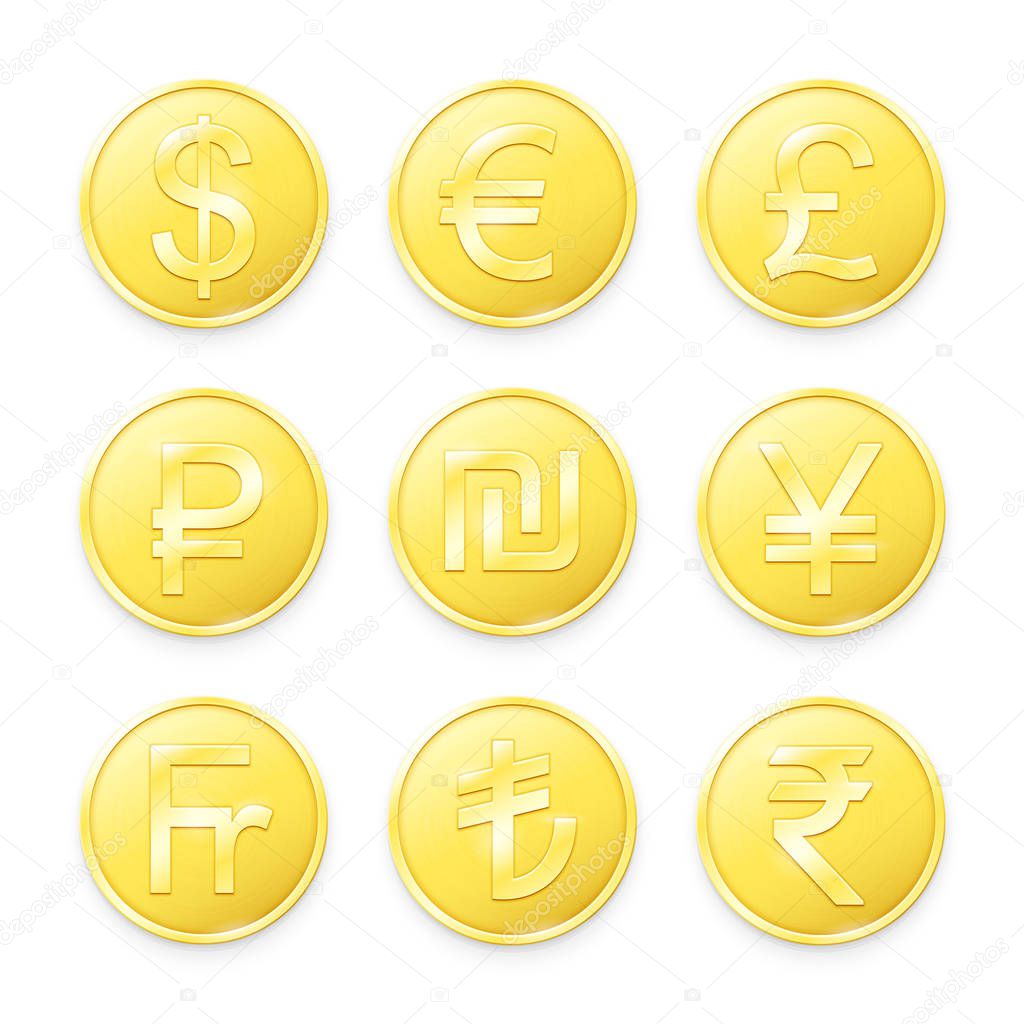 Colección de símbolo de monedas internacionales en vector de moneda de oro aislado en fondo