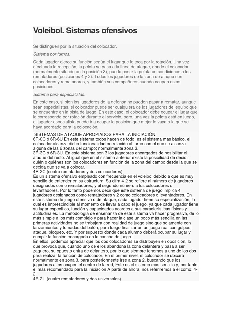 Puntuación: 4.8/5 ( 52 valoraciones ) Voleibol Sistemas ofensivos Un sistema ofensivo en vóley son los movimientos que se realizan para tener un ataque contundente engañando al bloqueo con jugadas pre-elaboradas de contundencia excepcional, un sistema defensivo por el contrario es la ubicación de los bloqueadores en la cancha para evitar.