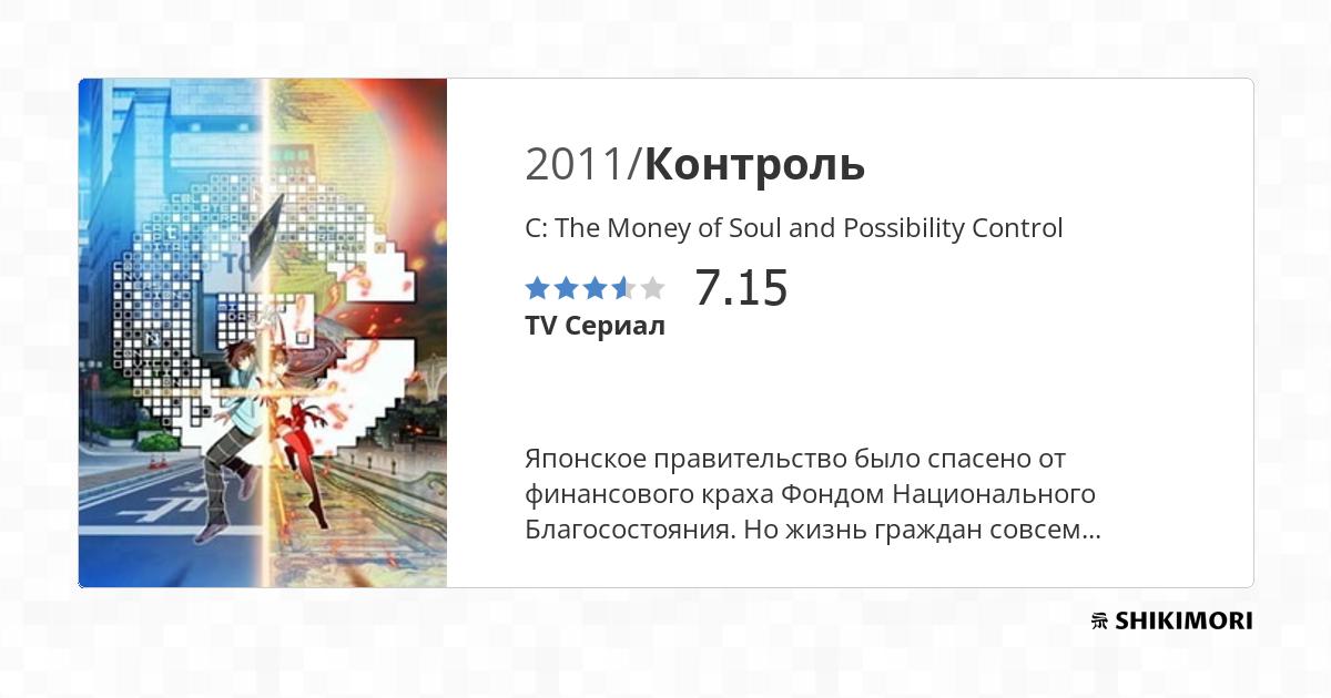 Jun 24, 2011. Vote. average 4.0. 377. Looking for episode specific information on C: The Money of Soul and Possibility Control ( [C] CONTROL - The Money and Soul of Possibility)? Then you should check out MyAnimeList! Money is power, and without it, life is meaningless. In a country whose economy is in shambles, second-year economics university.